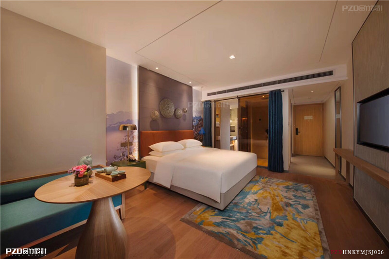 首先要确定地毯的作用,如果是用地毯来衬托家具或主立面,颜色和组团不能抢主角的颜色,应略淡定、素净,衬托家具或主立面丰富的色彩。如果将地毯确立为精品酒店设计中的主角,则要与其他装饰效果形式相比较,其图案和色彩要鲜艳突出,用地毯的图案和色彩来吸引人的注意力,冲淡门面和家具的装饰效果。
